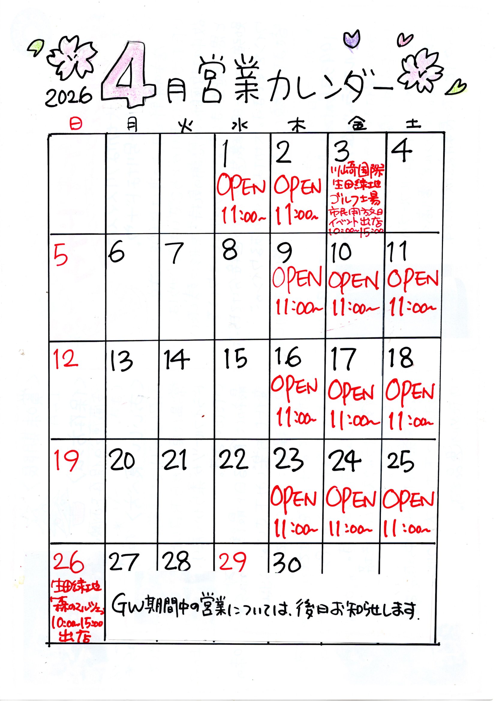 4月の営業日のお知らせです。